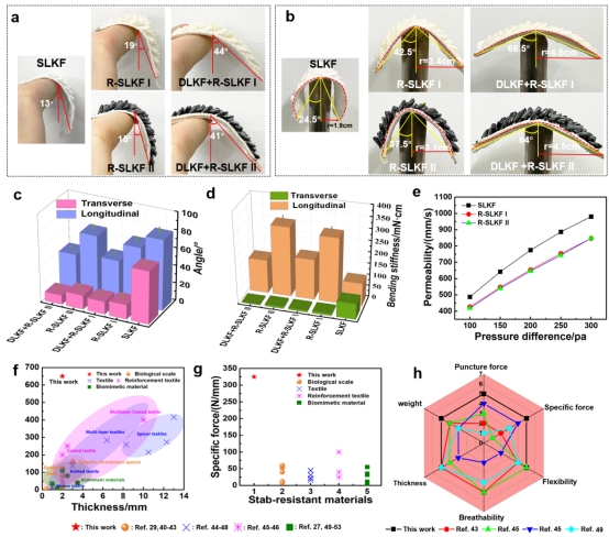 4 R-SLKF的柔韧性、透气性和综合特性比较(aSLKFR-SLKF在手掌上的弯曲角度;(bSLKFR-SLKF在圆形具上的悬垂角度;(cSLKFR-SLKF的垂度角;(dSLKFR-SLKF的弯曲刚度;(eSLKFR-SLKF的透气性;(f) 这项工作与先前报道的防刺材料之间的比较;(g)防刺材料的比峰值载荷;(h)与先前报道的防刺材料的综合性能比较