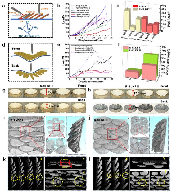图3 R-SLKF穿刺、正反面穿刺及CT扫描结果(a) 斜向穿刺刀尖处的应力分布;(bR-SLKF斜向穿刺防刺性能及c)在三个穿刺方向上的峰值载荷;(dR-SLKF正面和背面穿刺时的受力情况;(eR-SLKF正反面的穿刺情况及(f)峰值载荷;(gR-SLKF I和(hR-SLKF II正反面的穿刺过程;(i-kR-SLKF I和(j-lR-SLKF II在三个切片方向上的CT扫描结果