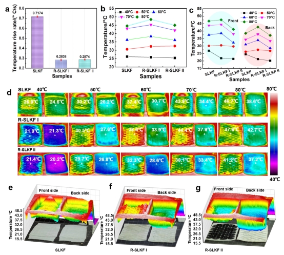 5 SLKFR-SLKF的热aSLKFR-SLKF的温升速率;(bSLKFR-SLKF表面的平均温度,及(c)在不同加热温度下正面和背面温度;(dSLKFR-SLKF在不同加热温度下的红外图片;(e-gSLKFR-SLKF60℃下的三维红外图片