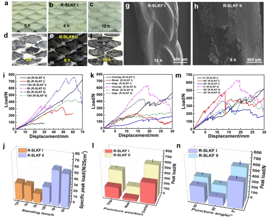 2 R-SLKF在不同基体静置时间、穿刺位置和方向下的防刺性能a-f基体在不同静置时间下制备的R-SLKF外观形态;gR-SLKF I和(hR-SLKF II的截面SEM图像i-j基体在不同静置时间下制备R-SLKF的防刺性能及比峰值载荷;k-lR-SLKF在三个不同穿刺位置的防刺性能及峰值载荷;m-nR-SLKF在三个不同穿刺位置的防刺性能及峰值载荷