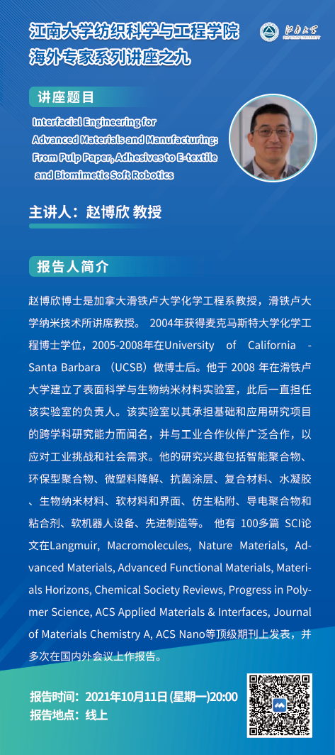 报告题目:Interfacial Engineering for Advanced Materials and Manufacturing: From Pulp Paper, Adhesives to E-textile and Biomimetic Soft Robotics