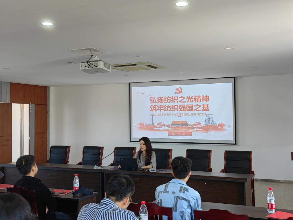 在座谈会上,储主任围绕“纺织精神”为大家介绍企业精神与企业文化,以从业者的视角阐释了“纺织精神”的内涵,使同学们深刻感受到“创业、报国、振兴民族大业,敬业、爱厂、发展毛纺事业”的协新企业精神。硕士第三党支部书记原韵开展《弘扬纺织之光精神,筑牢纺织强国之基》专题党课,以钱之光同志为代表的世代纺织人所积酝出来的“新时代纺织之光”精神,是纺织行业弥足珍贵的精神财富。通过钱之光先生的清廉故事激励学生党员政以洁己、奉公为先。