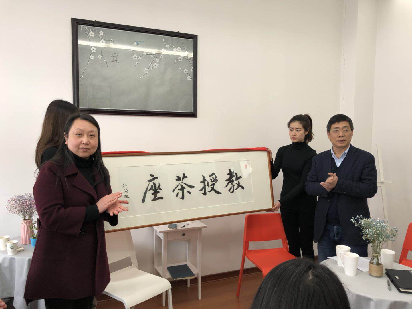 首先,张菁书记解读出了举办此栏目的初衷并提出了希望,她指出“青年兴则国家兴,青年强则国家强。”高校思想政治工作,关系着高校培养什么样的人、如何培养人以及为谁培养人这个根本问题。全国高校思政工作会议之后,各高校围绕树立“立德树人”的根本使命,都在认真思考和实践“谁来抓、抓什么、怎么抓”问题。作为基层学院要把思想政治工作贯穿教育教学全过程,把人才培养作为最重要的工作,围绕学生、关照学生、服务学生,努力实现全程育人、全方位育人。“教授茶座”栏目将定期组织教授课下与学生交流、解疑、释惑,发挥榜样的力量,将基层党组织建设与学院人才培养、学科发展、专业建设有机结合起来,是2018年学院加强和改进大学生思政政治教育手段创新、品牌创建的工作重点。她期望通过整合学院最优质的教育资源,为学生的成长成才助推加油,也期待“教授茶座”能够成为纺织服装学院党建思政工作的品牌和典范。随后,张菁书记与蒋高明教授共同为“教授茶座”揭牌。