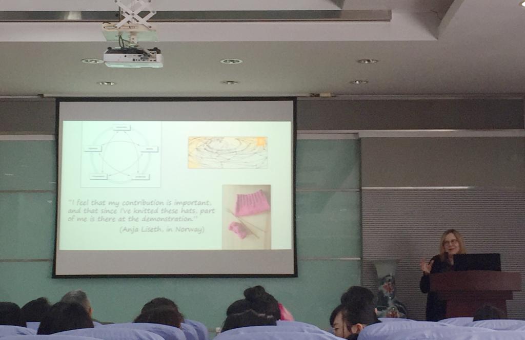 30日下午两点,研究生论坛在纺织服装学院B104举行,由服装系薛哲彬副教授主持,来自加州大学戴维斯分校设计学院的Alicia Decker、Dee Dee Yang、Christine Knobel和Lanwei Su四位研究生与江南大学纺织服装学院宋春会、李坤元、周倜、王志成四位硕博士研究生,分享他们的研究课题与成果,交流了服饰文化与社会学研究不同的思维方式,探讨了不同课题的研究思路与方法,为两院师生带来了启发与灵感。