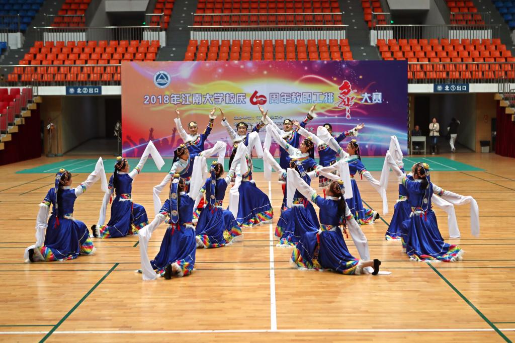 4月25日下午,江南大学2018年教职工排舞大赛在校体育馆举行。来自全校22个学院(单位)的500余名教职工参加了比赛。纺服学院党委书记张菁、院长付少海率队,派出由刘丹老师领衔的16位教师组成的舞蹈队参赛,荣获规定曲目三等奖,自选曲目三等奖,团体总分三等奖的佳绩。