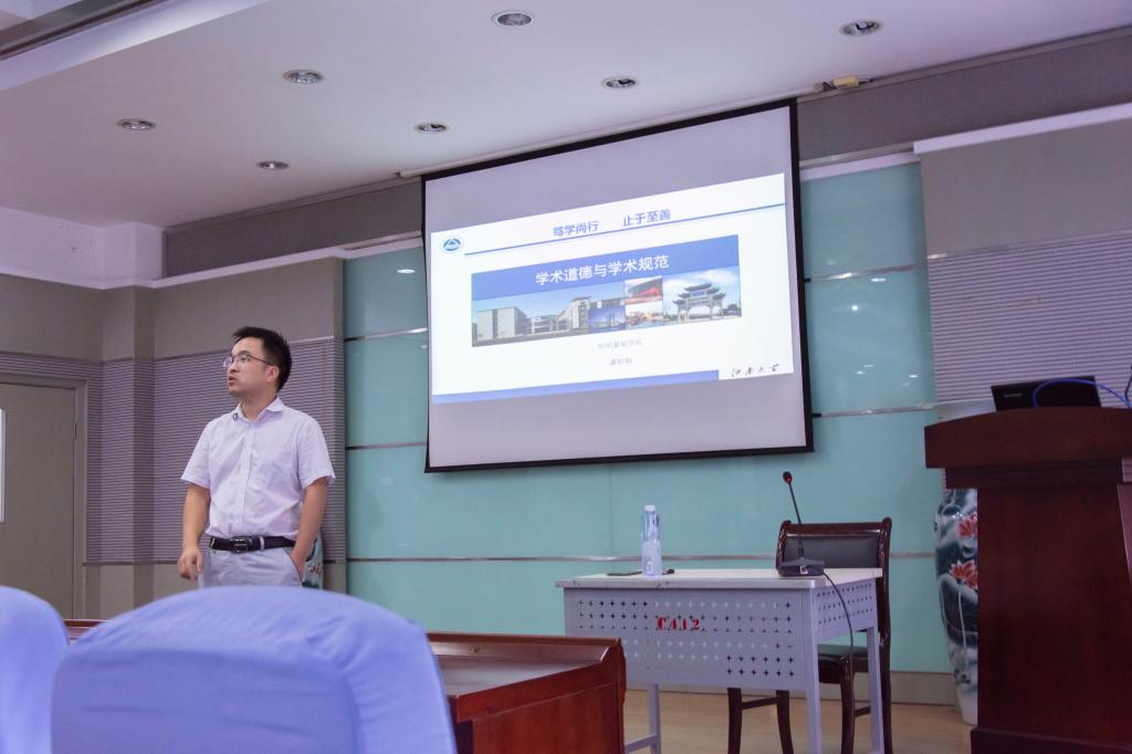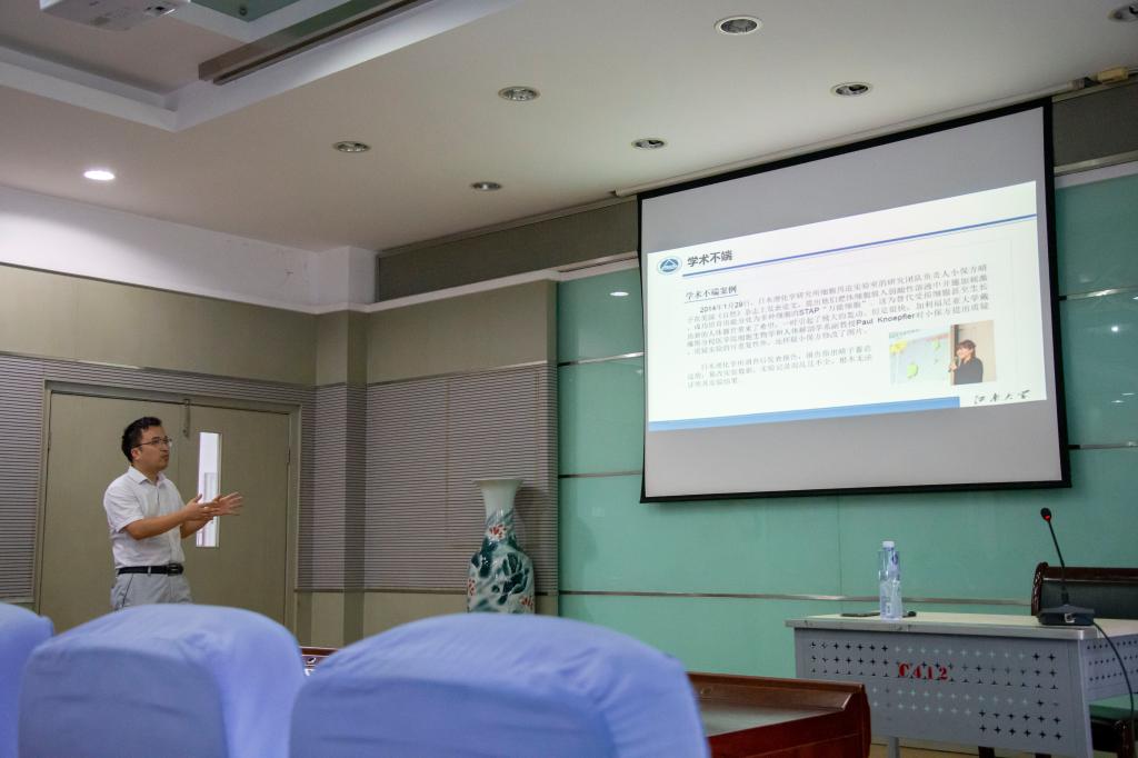 专题讲座在同学们热情的掌声中拉开帷幕。首先,潘如如副院长从湖南大学曹律和日本理化研究所小保方晴子两个学术不端代表案例的切入主题,以风趣幽默的讲解风格对“课题申报”、“研究对象与评价原则”以及“遵纪守法弘扬科学精神”等方面进行分析与讲解。之后,潘老师批评了国内某些公司在未进行实验的前提下,仅凭猜想捏造数据、申请专利等现象,并告诫研究生新生必须在实验的基础上发表各类学术论文,并且强调原始实验记录保留的重要性。潘如如副院长同时也列举了近年来因伪造数据、剽窃引发的各类案件。最后,潘老师指出,作为一名研究生的责任和义务,并要求学生们在生活中严格要求自己,找到正确定位,为以后的科研道路与生活打下良好的基础。