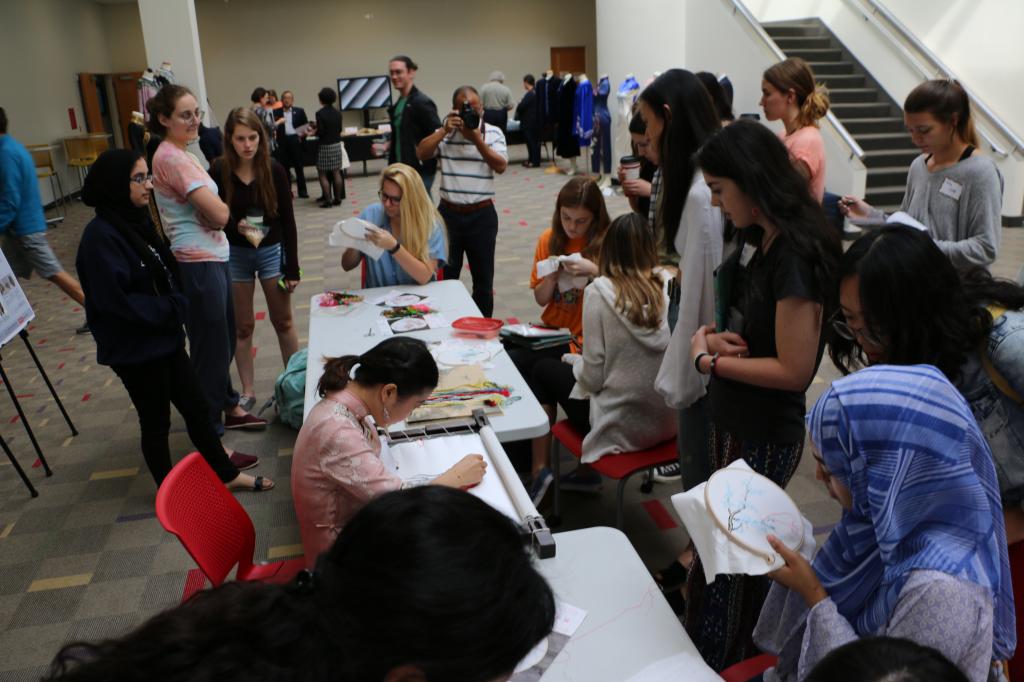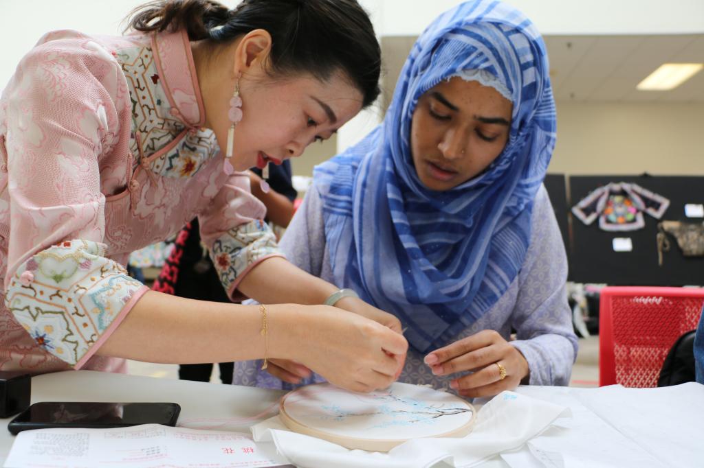 开幕式结束后,师生纷纷前往展览场地进行刺绣技艺体验活动。在工艺美术师、苏绣青年艺术家陆燕绪女士,江南大学纺织服装学院副教授刘冬云、徐亚平的指导下,来自不同文化背景的海内外观者学习了不同的刺绣技法,体验到刺绣技艺的匠心与巧妙,更加直观的令海外受众能够感受到博大精深的中国传统文化。活动全程受到多方媒体与社会团体的密切关注,并对此次活动进行了详细的记录与宣传,对此次活动给予了极大的肯定。