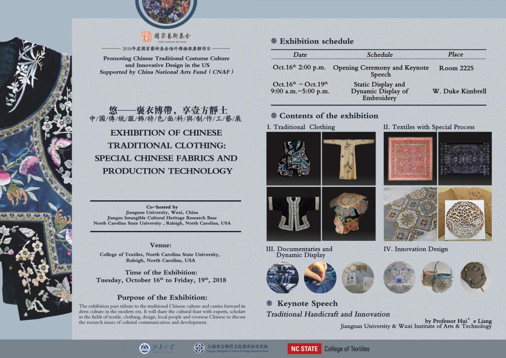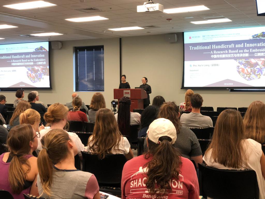 项目由江南大学组织实施,纺织服装学院服饰文化研究团队、江苏省非物质文化遗产研究基地主办。此次北卡罗莱纳州立大学站海外巡展以中国传统特色面料与工艺为主要内容,本着“传播中华传统服饰文化,促进服饰遗产创新应用”主旨,通过实物展示、传统技艺视频播放、文字图片平面展示、刺绣技艺体验以及主题演讲,展现中国传统服饰技艺的博大精深。同时,借由中国传统服饰技艺的创新应用设计,丰富传统手工技艺应用新方法,赋予传统手工技艺新活力。实物展示包含江南大学汉族民间服饰传习馆馆藏传统手工技艺服饰品、特殊制造工艺面料、蓝印花布制作工具与成品、当代刺绣艺术家作品以及江南大学服装设计团队“2014年北京APEC会议领导人服装设计作品”在内的七十余件展品。学术报告以“中国传统服饰技艺和传承(Traditional Handicraft and Innovation)”为主题,项目负责人梁惠娥教授同在场的嘉宾与师生分享了中国传统服饰技艺种类,以刺绣为例,详细介绍了手工技艺制作方法、风格特征及文化意涵,并结合当下全球发展趋势,展示创新设计应用作品,就日后传统技艺传承提出了新的观点。主题演讲中,在场师生反响热烈,不少师生对其中的刺绣技法展现出浓厚的兴趣。