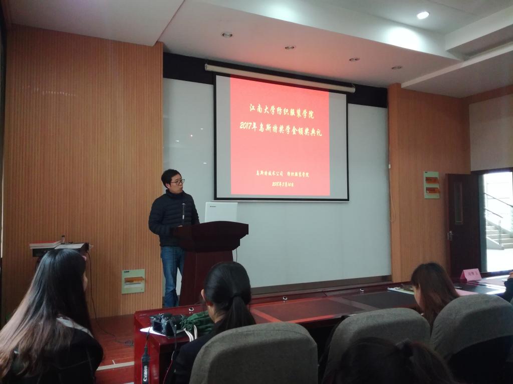 3月14日下午,“乌斯特奖学金”颁奖典礼在江南大学纺织服装学院B104报告厅隆重举行。乌斯特中国区公司发展部经理刘智玉,江南大学纺织服装学院党委副书记、副院长周云龙,江南大学纺织服装学院分团委副书记徐雅静出席了此次颁奖典礼。参加本次颁奖典礼的还有2017年乌斯特奖学金获奖者,17级硕士研究生代表及纺织工程专业本科生代表。