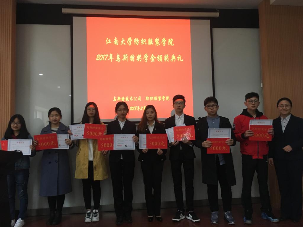 乌斯特技术公司是世界上纺织质量控制市场的领先企业,是服务于世界纺织市场的三大企业之一。是从纤维到织物的纺织品质量控制领域的全球市场领导者,在纺织品测试及监控领域,乌斯特拥有无可比拟的六十余年的专业经验。乌斯特每年在纺织服装学院设立奖学金4万元,是用于激励同学们勤奋好学、刻苦钻研、全面发展、立志成才,加强科技创新能力,从而更好地服务于社会。