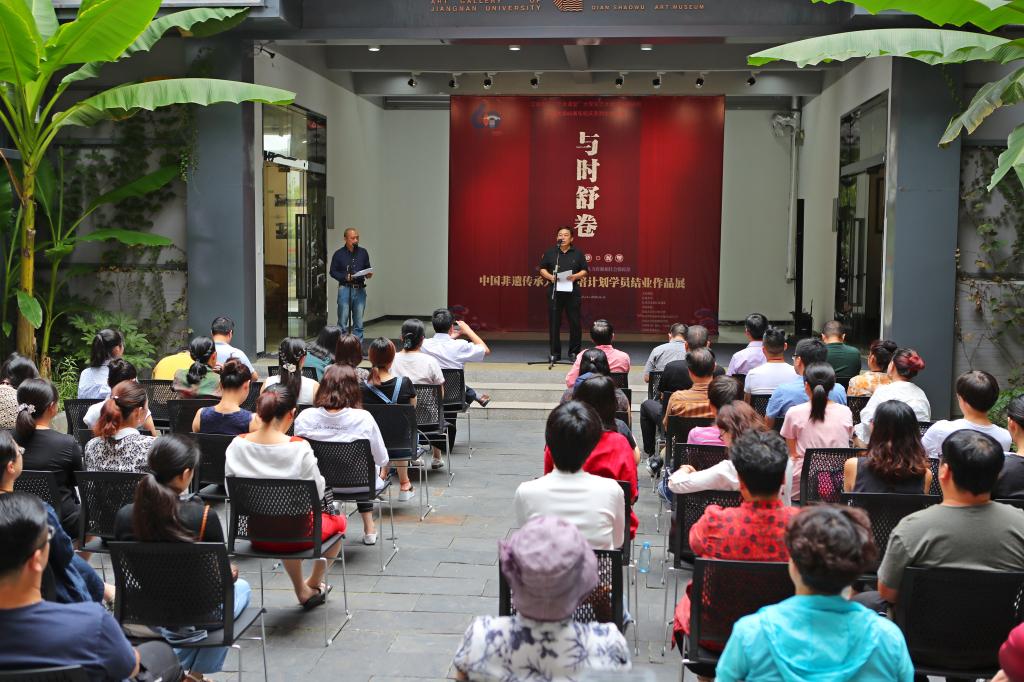 开幕式之后,纺织类非遗、紫砂泥塑类非遗,非物质文化遗产传承人68位研培学员共计140余件结业作品正式对外展示学习成果,本次展览适逢江南大学建校60周年,作为校庆系列活动之一及江南大学党委宣传部艺术课堂拓展项目,得到江南大学宣传部、社科处、纺织服装学院、江南大学钱绍武艺术馆等全力支持。