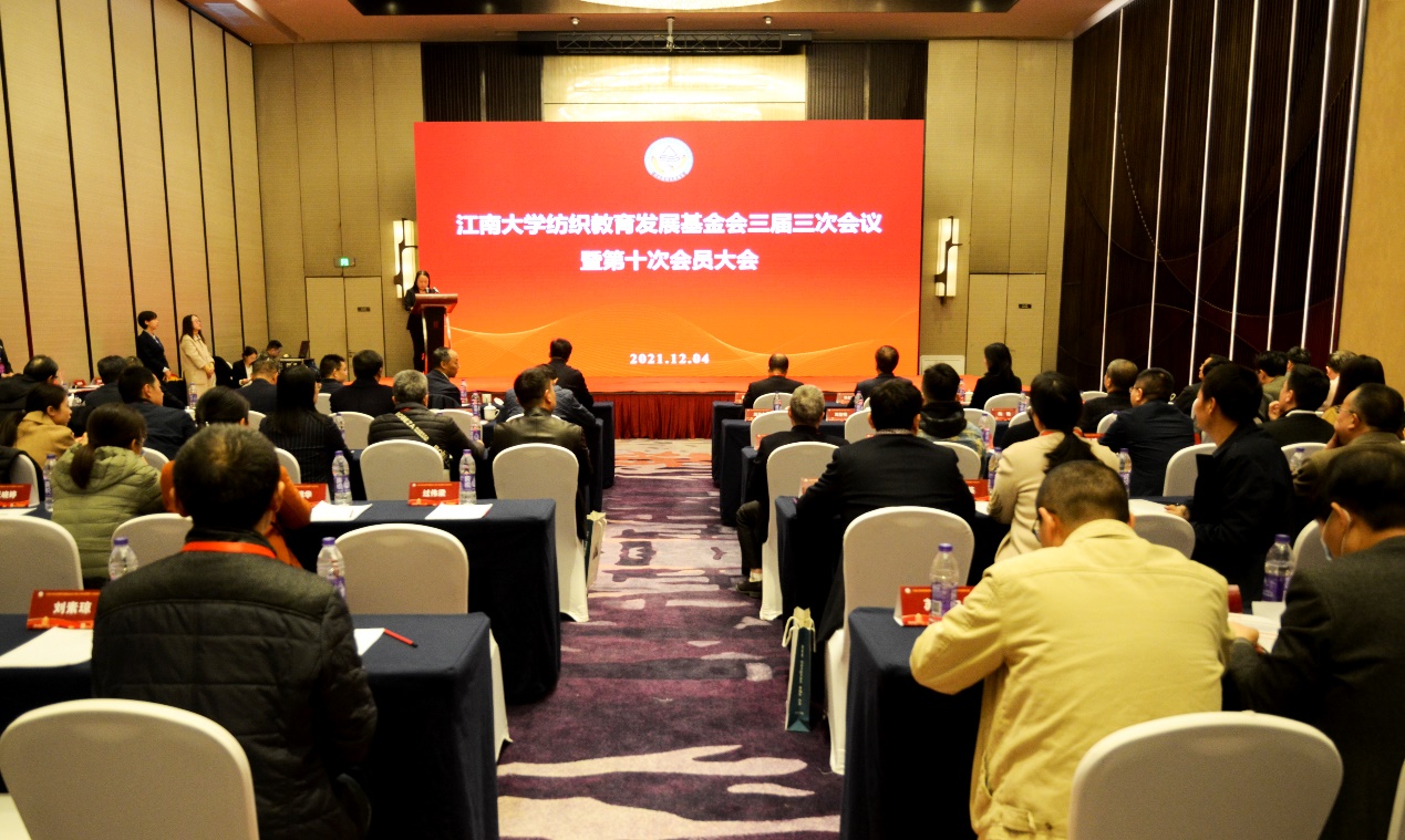 12月4日,江南大学纺织教育发展基金会三届三次会议暨第十次会员大会在无锡太湖华邑酒店隆重召开,江南大学党委副书记符惠明,校党委常委、党办主任朱飞,校社会资源处处长黄敏,基金会理事长高卫东,基金会副理事长江苏省省属企业外部董事蒋金华,无锡一棉纺织集团党委书记、董事长周晔珺,苏州江赛纺织科技有限公司董事长王洋,无锡工艺职业技术学院党委书记、无锡学院副校长梁惠娥,江南大学人力资源处处长王鸿博,江南大学针织技术教育部工程研究中心主任蒋高明等,以及一百多名会员及获奖师生参加了本届大会。会议由bwin必赢中国官网党委书记、基金会秘书长张菁主持。