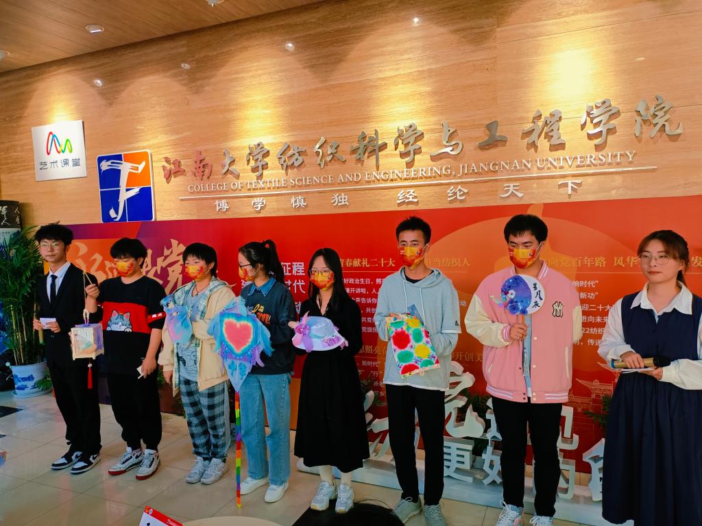 本次“青春芳华”创意扎染设计大赛2.0以“织青春锦绣,染飞彩流年”为创作主题。各参赛队围绕“青春心向党”、“风景旧曾谙”、“国风万古存”三个方向,使用统一分发的材料,运用不同的扎染手法,结合自己的灵感创意与生活体验,分别在布料上对爱党爱国、江南好风景以及传统文化的传承这三方面进行创作。参赛队运用染好的布料对一些常见的物品进行装饰,通过体验传统染整工艺技术的魅力以及通过设计、装饰来将传统工艺与普通物品相结合,从而碰撞出一场震撼人心的视觉盛宴。“大橘今天吃包子了吗队”用淡紫色渲染出凌霜傲然的不败秋花,辅以装饰,最终绽放于小巧玲珑的灯笼之上;“啊对对对队”用鲜艳的色彩,染出了关于女娲补天的内容创作,表达出对国潮兴起、国风永存的展望;“干什么都队”用一颗爱国爱党的赤诚之心装饰出一面风筝,寓意放飞理想向未来;“三元一次方程组队”以黛紫、官黄相互结合,染出独具韵味的江南春色;“你说的都对队”以孔雀石绿、玫红、明黄为主题色创作,将染布呈现于笔帘之上,体现出一种自然融合的美感;“你说的都对plus队”依托于繁星密布的浩渺星空,并与团扇有机结合,诠释出无限遐想的中国传统之美。这些优秀参赛作品传递出江南学子爱党爱国爱校的深厚情怀,展现了纺织青年敢于创新的精神风貌,丰富了同学们的课余文化生活,提高了青年学子的艺术审美修养和艺术表现才能。