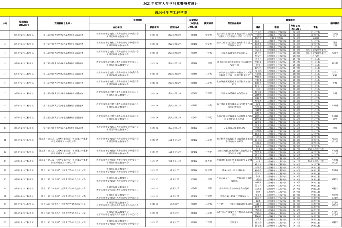 在第十二届“新澳杯”全国大学生纱线设计大赛中,我院学子共获奖7项,其中特等奖1项、一等奖1项、二等奖1项、三等奖4项;由黄锋林老师指导,纺织1801班金利平同学负责的科创作品《环保纺织—可回用花式纱》荣获全国特等奖。在第三届全国大学生绿色染整科技创新竞赛中,我院学子共获奖10项,其中特等奖2项、一等奖2项、二等奖1项、三等奖5项;由付少海、关玉两位老师指导,轻化1803班王文婷同学负责的科创作品《基于同轴涂覆法制备的也颈线位温度传感器及其在智能纺织品上的应用》及周曼、王强两位老师指导,轻化1802班陈秋月同学负责的科创作品《基于二硫桥交联涂层的棉织物高强力保留抗皱整理》荣获全国特等奖。在第九届“金三发•兰精•安德里茨”杯全国大学生非织造材料开发与应用大赛中,我院学子共获奖3项,其中三等奖2项、优秀奖1项。