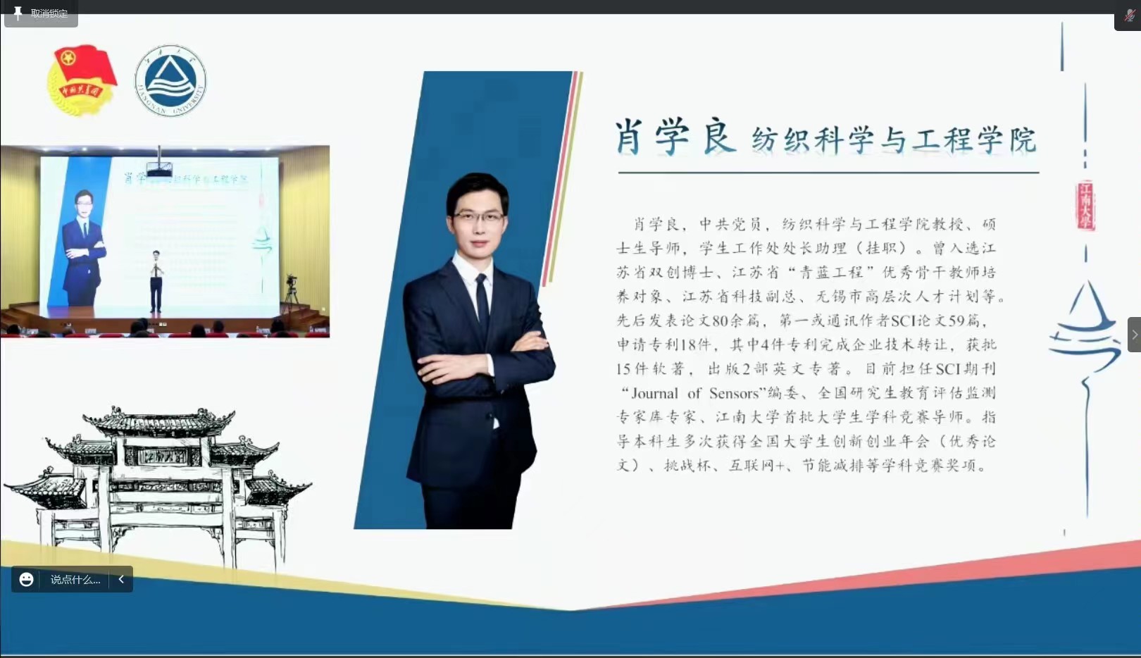 纺织育人正当时,师生奋进皆可期。决赛现场,肖学良老师以自身求学经历出发,通过学生视角,从教学成果、科创竞赛、成长指导等多个方面,讲述了自己在七年教师生涯里与学生间的真挚师生情谊,充分展示了bwin必赢中国官网教师“严管厚爱”的育人理念、认真务实的工作态度以及扎实的专业素养。作为一名扑在教学一线的年轻教师,肖学良老师始终牢记“江南纺织人”的使命与担当,着力提高学生的知识积累和创新创业能力,鼓励学生走进实验室,积极开展课题研究,为实现纺织服务民生福祉贡献青年力量。汇报展示中,bwin必赢中国官网学生代表还通过现场“三句半”、线上送祝福等丰富形式为肖老师加油助力。