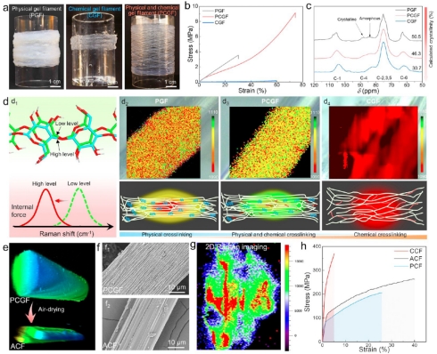 近期,bwin必赢中国官网龙柱教授团队联合安徽农业大学叶冬冬团队,创造性地开发了美学纤维素纤维(ACF)的制备方法,破解了上述难题。所制备的ACFs在交叉偏振光下呈现斑斓的彩虹色,还表现出极强的韧性,即使单根纤维也可承受100克的重量,并且经过反复缠绕和解缠,纤维表面的有序纳米结构并未被破坏。更有趣的是,作者通过拉曼成像证实,简单的水触发即可调控ACF的内应力,从而实现纤维三维形态的自主定制:湿态下,纤维内应力极低,可以实现纤维的临时造型;而随着纤维逐渐干燥,纤维内应力开始变大,从而实现纤维复杂3D造型的记忆。
