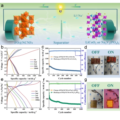 此外,制备的全电池FO@NCNFs-6//LiCoO2FO@NCNFs-6//Na3V2(PO4)3可至少点亮45LED灯泡组成的灯牌,显示出实际应用前景。因此,这种从纳米尺度到宏观尺度调控的纺锤链结构,将为高能密度与功率密度纤维电极材料的制备及其在下一代可充电电池中的应用提供新的视角。