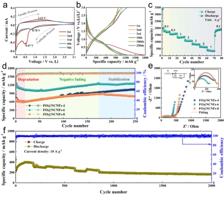 为了研究结构-性能关系,研究人员对其循环性能、倍率性能等电化学性能进行测试。FO@NCNFs作为锂离子电池负极材料,在10 A/g的电流密度下循环2000圈,放电容量为167 mAh/g。作为钠离子电池负极材料显示出超长的循环稳定性,在2A/g电流密度下循环2000圈可逆容量为260 mAh/g,在8 A/g电流密度下循环7000圈放电容量为102 mAh/g研究结果表明,在充放电循环过程中,纺锤链状FO@NCNFs复合纳米纤维具有良好的空间约束效应,可以缓解FexOy的体积膨胀效应,同时促进离子/电子迁移。此外,基于碳骨架良好的导电性和机械强度,提高了FO@NCNFs的动力学过程,相应地保持了结构稳定性和连续的电子迁移,这对于提高LIBs/ SIBs的倍率性能和循环寿命具有较大优势