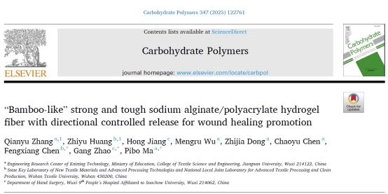 近日,bwin必赢中国官网针织技术教育部工程研究中心蒋高明教授团队在材料领域一区TOP期刊《Carbohydrate Polymers》(IF=10.7)上发表题为““Bamboo-like” Strong and Tough Sodium Alginate/Polyacrylate Hydrogel Fiber with Directional Controlled Release for Wound Healing Promotion”的研究论文。江南大学蒋高明教授团队马丕波教授、武汉纺织大学陈凤翔教授与无锡市第九人民医院赵刚教授为论文共同通讯作者。该研究得到了国家自然科学基金(52373058,11972172)、湖北省自然科学基金(No.2023AFB828)、湖北省自然科学基金创新团队计划(No.2023AFA027)、中央高校基本科研业务费专项基金(JUSRP62005)、江苏高校优势学科建设工程项目 (PAP)、无锡市卫生部重点科研项目(Z202219)、湖北省数字化纺织设备重点实验室开放基金(No.2023022)、国家地方联合纺织先进加工与清洁生产实验室开放基金(No.17);江苏省研究生科研与实践创新项目(KYCX24_2555)的支持。