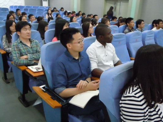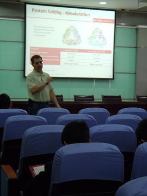 此次报告中Lucian A. Lucia副教授对大豆蛋白作为生物材料的化学高级应用进行了详细的阐述,突出介绍了大豆蛋白的水解、改性、气凝胶等一系列研究及其应用。整个学术报告历时1个小时,Lucian A. Lucia副教授幽默风趣,语言浅显易懂,现场气氛生动活跃,报告内容精彩纷呈。讲座结束后, Lucian A. Lucia副教授对参会师生提出的问题一一进行了解答,由此加深了与会师生对大豆蛋白的认识,激发了大家的研究兴趣和热情。