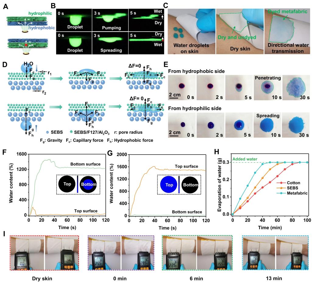 近日,江南大学魏取福教授、吕鹏飞研究员提出了一种具有单向导湿的非织造布超织物,结合了辐射冷却和蒸发散热,以实现高性能的个人热、湿管理。这种超织物通过大规模静电纺丝和分层结构设计表现出优异的光谱选择性(太阳光反射率≈92%,大气窗口热发射率≈97%)和Janus润湿性,并且还具有优异的弹性、透气/透湿性。可实现低于环境温度约6.5 °C的降温性能和快速的吸湿排汗作用(水分蒸发率为0.31 g h-1,水分传输指数为1220%)。此外,可以通过施加各种应变(0-100%)来调节超织物的冷却性能。超织物的成本效益和良好的可穿戴性为可持续能源、智能纺织品和热湿舒适应用提供了一种普适策略。以上研究成果近期以“Dynamically Tunable Subambient Daytime Radiative Cooling Metafabric with Janus Wettability”为题,发表在国际权威期刊《Advanced Functional Materials》上。bwin必赢中国官网的博士研究生樊崇辉为文章第一作者,江南大学魏取福教授、吕鹏飞研究员为论文共同通讯作者。该研究工作得到了国家自然科学基金、江苏省自然科学基金和江南大学高层次人才引进计划等项目支持。