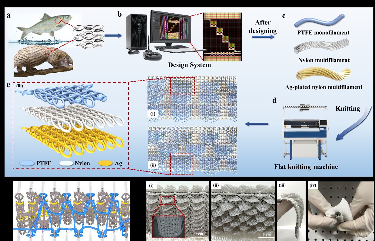 为解决上述问题,江南大学针织中心团队以仿生鳞片结构为启发,通过针织全成形(3d-knitting)编织技术,织造了兼具智能性(能量采集和传感)与功能性(拒水和物理保护)的三维仿生鳞片针织结构摩擦纳米发电机(BSK-TENG)。利用BSK-TENG作为自供电、可穿戴的人机交互传感设备,设计并制造了一种具有无线信号传输功能的多功能智能个人户外救援系统。通过手指触摸,可轻松实现一键呼救。此外,仿生鳞片针织结构材料在弯曲过程中表现出的各向异性,可为人体关节提供支撑保护的同时,保持织物固有的良好性能,如柔性及穿着舒适性,可满足保护性和灵活性的矛盾要求,这对智能户外服装的应用至关重要。这项研究表明,兼具智能性和功能性的BSK-TENG在多功能智能纺织品、智能结构材料、及智能防护材料等领域具有广阔的应用前景。