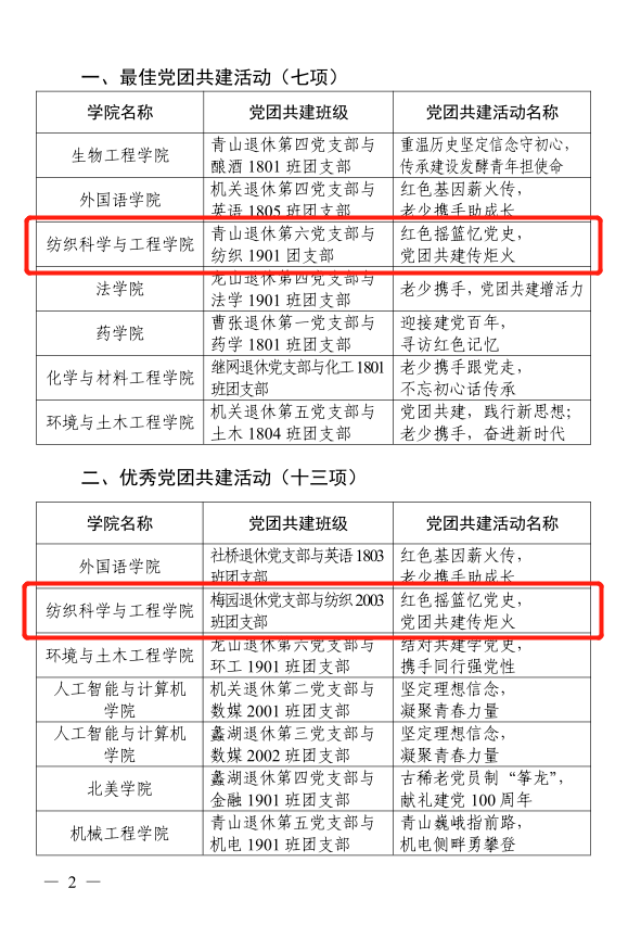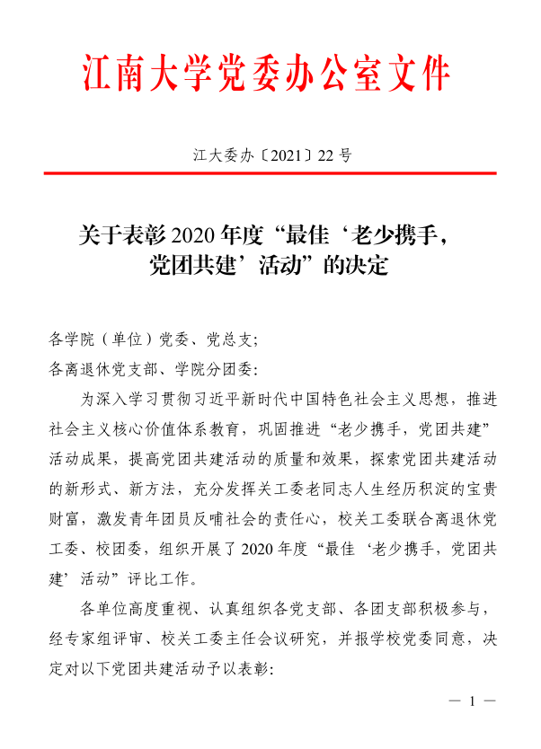 近日,学校党委公布了《关于表彰 2020 年度“最佳‘老少携手,党团共建’活动”的决定》,经专家组评审、校关工委主任会议研究,并报学校党委同意,bwin必赢中国官网报送的两项活动均获表彰。其中青山退休第六党支部与纺织1901团支部组织申报的活动荣获“最佳党团共建活动”(全校共七项),梅园退休党支部与纺织2003班团支部组织申报的活动荣获“优秀党团共建活动”。
