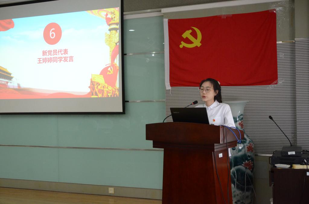 纺织工程1802班王婷婷同学作为新党员代表发言。她首先表明了入党的动机和决心,对树立榜样的党员前辈们表示感谢,同时也表达了作为一名学生党员应该担起的责任和今后努力的方向,展现了年轻新党员的坚定信念和热血初心。