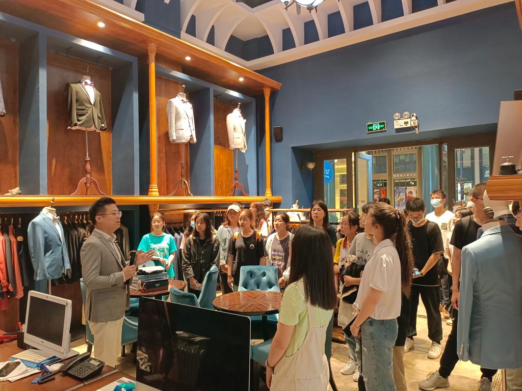 接下来,师生来到科技园区内的学生创业企业参观。在b站百万粉丝up主神奇的老皮VFX的工作室,同学们了解到视频博主的幕后团队工作,并对团队高超的特效技术和极具创新性的策划赞叹不已。在无锡市远方文化传媒科技有限公司,同学们聆听了公司负责人的创业经验谈,纷纷表示要在保证学业成绩的同时不断提升自己的创新能力,多体验、多挑战。最后,一行人来到位处华莱坞影都的麦梯定制店铺参观,这是原江南大学纺织服装学院的校友马腾创办的麦梯时尚创意设计有限公司。公司以西装定制为主营业务,曾获江苏省创业明星单位、江苏省优秀民营科技企业、江苏省青年创业见习基地等荣誉称号。马腾学长深情回忆了在学校度过的美好时光,认真为同学们讲解了西服定制的专业相关知识,分析了纺织行业的现状,鼓励大家敢于创新,敢于拼搏,期待同学们运用专业知识在纺织服装行业创造自己的价值。精彩的演讲赢得同学们的阵阵喝彩。