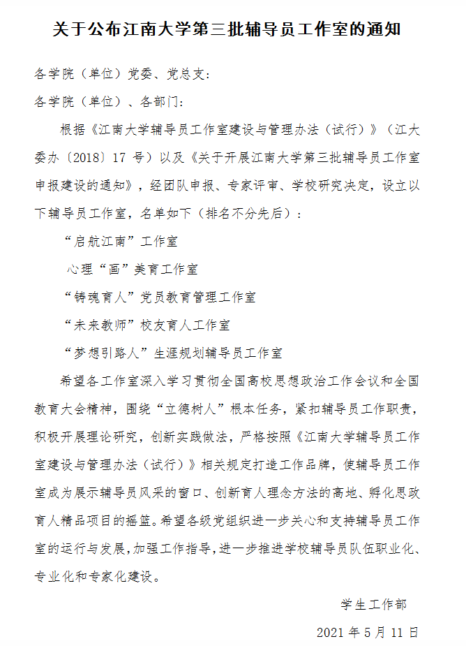 近日,根据学校《关于开展江南大学第三批辅导员工作室申报建设的通知》,学院党委副书记陈艳君主持申报的“启航江南”辅导员工作室获批江南大学第三批辅导员工作室立项建设。