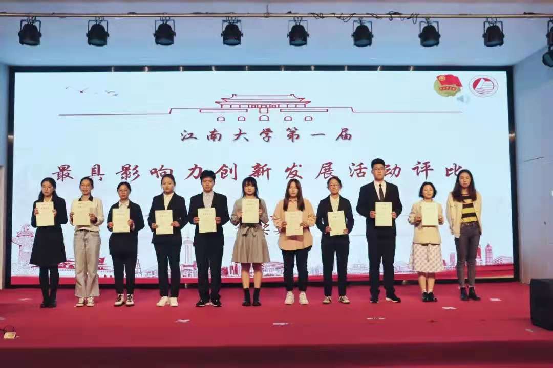 为展现学院在创新创业、服务同学等方面的工作成效,树立优异典型,在各学院中营造争先创优的良好氛围,同时扩大真正有益于学生发展的活动的知名度,5月20日晚,由共青团江南大学委员会主办,江南大学学生会承办的第一届“创新引领青年,发展筑梦未来”江南大学最具影响力创新发展活动评比在北区大学生活动中心F105举行。bwin必赢中国官网“百年锦绣—创意扎染设计大赛”成功获评江南大学第一届“最具影响力创新发展活动”。