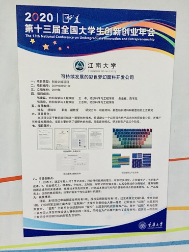 10月30日—11月1日,以“智汇青春 开创未来”为主题的第十三届全国大学生创新创业年会在重庆大学举行。bwin必赢中国官网杨瑞华副教授指导2018级本科生张康磊等负责的国家级创业训练项目《可持续发展的彩色梦幻面料开发公司》从众多项目中脱颖而出,入选本届年会,进行线上展示。