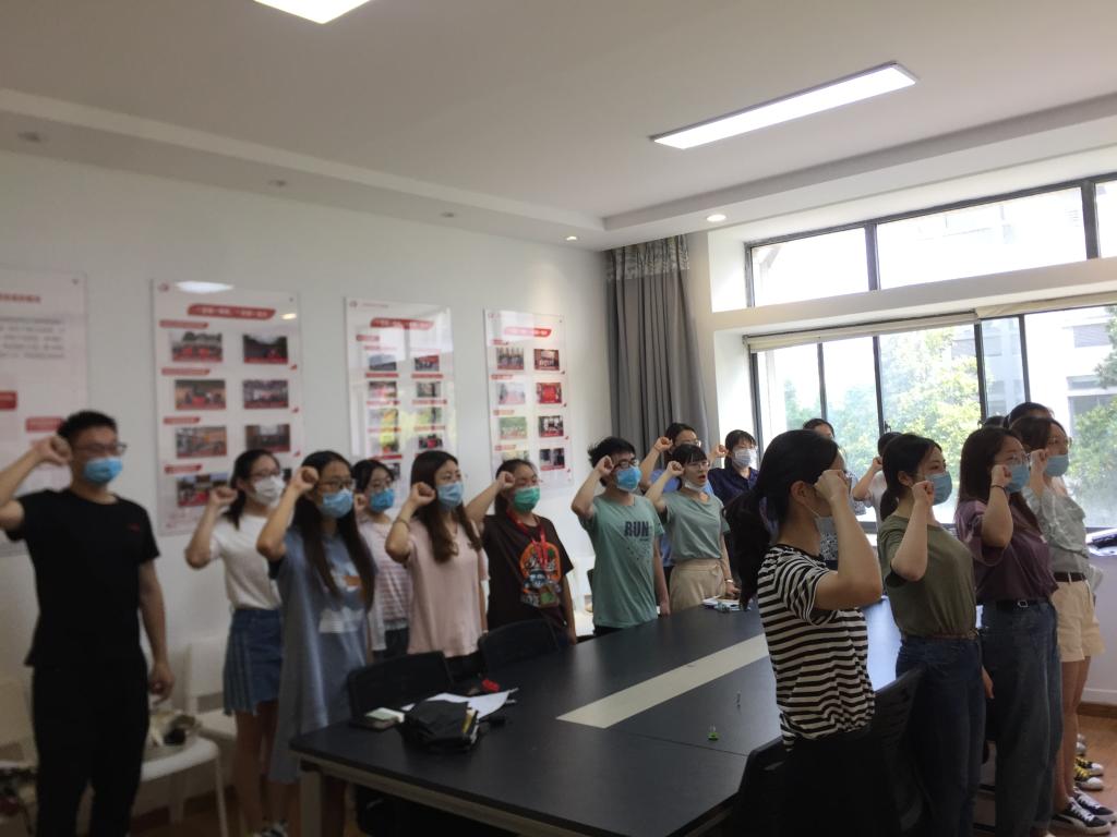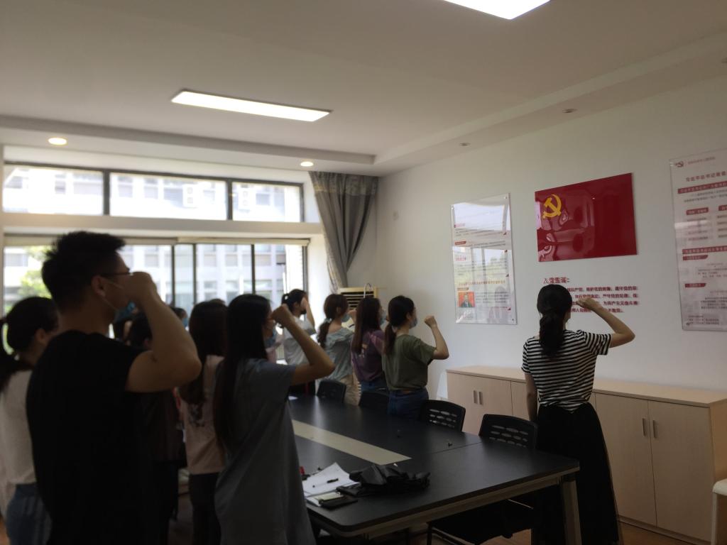 在支部宣传委员张倩同志的带领下,毕业生党员全体起立,面对鲜红的党旗,举起右手、握紧拳头,庄严宣誓。毕业生重温入党誓词,表达了对坚定政治信念和时刻不忘初心、矢志永远奋斗的坚定决心。