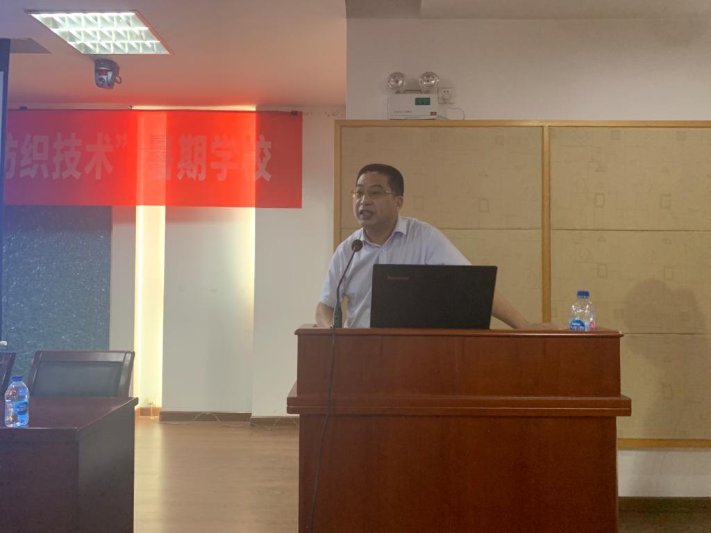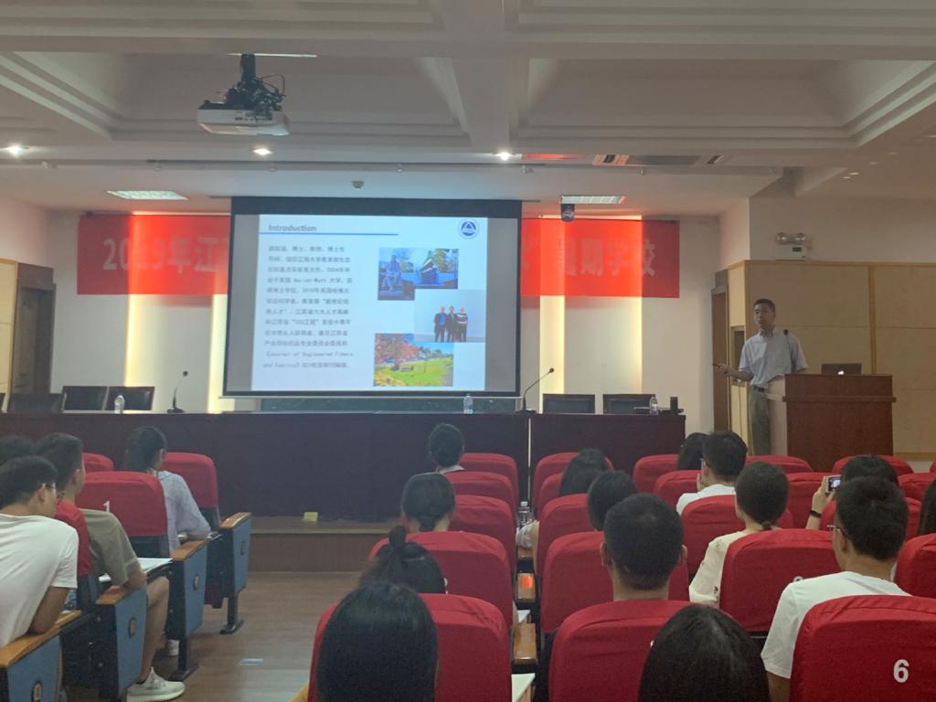 江南大学纺织服装学院副院长潘如如教授主持开场,对各位远道而来的学员表示热烈欢迎。研究生院副院长姚文生老师和纺织服装学院党委书记张菁老师分别致词,指出本次暑期学校意在加强研究生的科研能力,引领学术前沿,提高研究生进行科学研究的综合能力,促进纺织行业发展,打破学校和学科界限。纺织服装学院院长付少海教授发表讲话,简述了江南大学的发展历程,师资力量以及学术成果等,表示研究生暑期学校是一场重要的学术交流活动,也鼓励同学们积极参与到后期的学术交流。开班仪式结束后所有学员和老师在文浩馆门口进行了合影留念。9时讲座正式开始,江南大学教务处处长、教育部生态纺织重点实验室主任魏取福教授带来了精彩的学术讲座“纺织材料表面和界面功能结构构建研究”,阐述了纺织材料的表面与界面性能,从仿生学角度介绍了一些自然现象和所在课题组的相关课题研究。接下来北京服装学院材料科学与工程学院的王建明教授带来主题为新型分散染料及阳离子染料常压可染涤纶的演讲,就节能减排这个话题,分别介绍了两种新型纤维,NEDDP和NECDP。此两种纤维均具有可纺性好、自亲水功能以及永久性吸湿排汗功能,并将NECDP与国内外企业ECDP纤维染色情况进行比较评价。