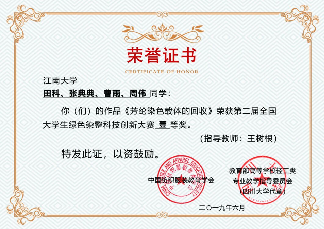 江南大学纺织服装学院共5项作品参评,由王平老师指导的项目《蛋白质纤维原位染色与级联酶催化功能整理》(学生负责人魏叶)荣获特等奖;由张丽平老师指导的项目《聚乳酸纤维原液着色技术研究》(学生负责人龚筱丹)和由王树根老师指导的项目《芳纶染色载体的回收》(学生负责人田科)荣获一等奖;由任学宏、刘颖老师指导的项目《一种抗菌/油水分离纳晶纤维素气凝胶的制备与应用》(学生负责人张艳)荣获二等奖;由袁久刚老师指导的项目《基于DES体系的羊毛低温染色及防缩加工技术》(学生负责人张依依)荣获三等奖。