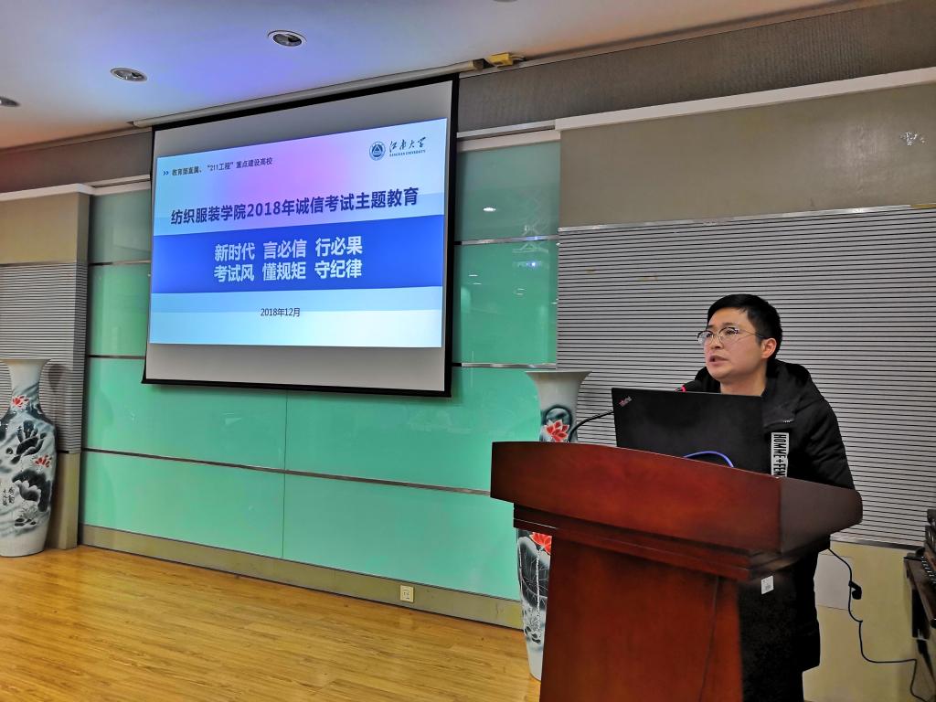 随后,进行2018年度评奖评优颁奖典礼,学院奖助工作分管辅导员陈裕老师宣读2018年度国家奖学金、优秀学业辅导员、三好学生标兵以及先进班集体获奖名单,并对2018年学院奖助政策进行解读,学院领导和老师为获奖学生颁奖。国家奖学金、三好学生标兵获得者苏江玥代表获奖学生发言,与同学们分享自己大学学习生活经历和体会,鼓励大家能够充分利用大学学习时光,在学习中奋进,不断提升自身能力。纺织1603班团支书储瑶作为先进班集体代表进行风采展示,从自身学习心得、宿舍学习风气培养以及班级学风建设等方面交流学习经验,分享成长感悟,通过凝聚共识、严格纪律、结对帮带等方式不断提高班级学习意识、营造班级优良学风。此外,陈裕老师针对即将开始的期末考试,向与会的各班级学生代表,开展诚信考试主题教育,加强同学们对诚信考试的重视,进一步引导同学们端正考风考纪。