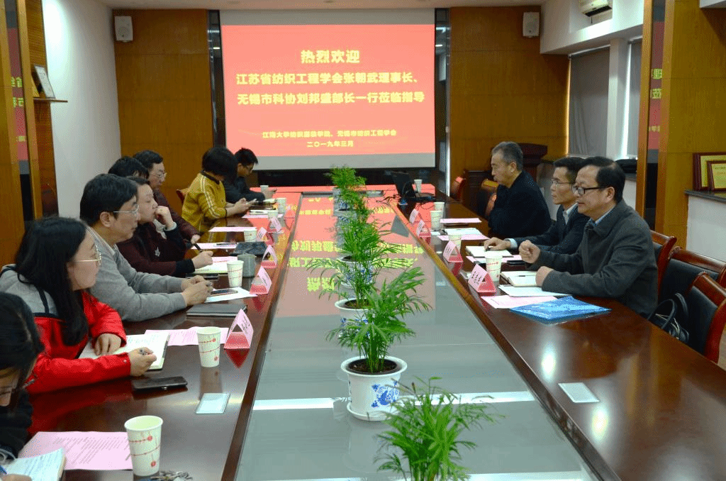 3月28日下午,江苏省纺织工程学会理事长张朝武、秘书长王志杰、无锡市科学技术协会学会部刘邦盛部长一行赴学院调研无锡市纺织工程学会、省纺织工程学会各专委会推广新技术新产品和成果转化、开展学术交流、进行科普活动情况。江南大学纺织服装学院党委书记张菁,江苏省纺织工程学会化纤专业委员会主任葛明桥教授、服饰专业委员会主任沈雷教授、无锡市纺织工程学会秘书长徐阳教授、省纺织工程学会针织专业委员会秘书万爱兰副教授、无锡市纺织工程学会副秘书长杨小艺以及部分市级学会专委会秘书参加了调研座谈。