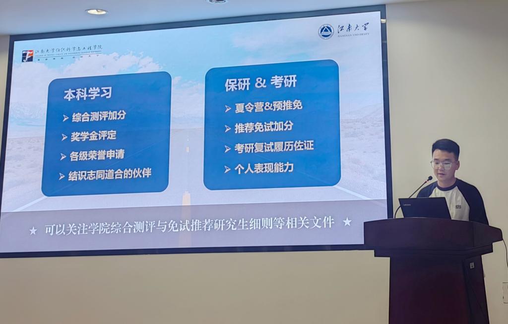 随后,2022级研究生王傲从个人竞赛经历、热门赛事时间和参赛线梳理等方面对本科阶段的竞赛进行了介绍与分享,提醒同学们对重要赛事提前关注,选择性参与适合自己的竞赛,为本科阶段的学习锦上添花。2020级本科生王艺博作为国家级大学生创新项目负责人,从科研经历、大创流程、经验总结等方面对大创进行了介绍,重点讲述了大创前期准备流程,让同学们能够为项目开展做预准备。