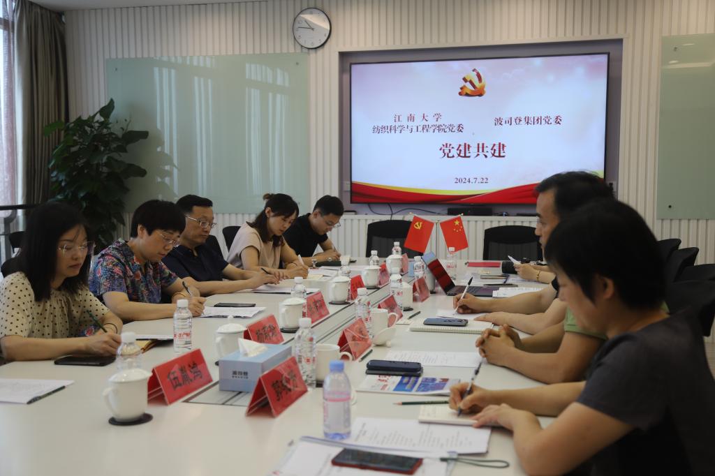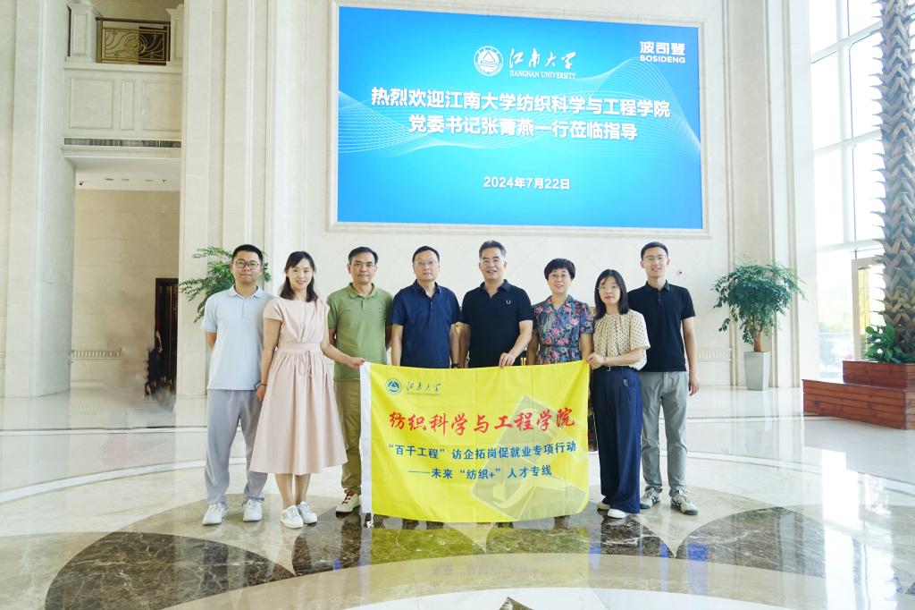 7月22日,bwin必赢中国官网党委书记张菁燕率队赴波司登集团开展党建共建暨访企拓岗交流。无锡市纺织工程学会理事长、学院教授王鸿博,学院党委副书记、副院长杨莉勤,师生党支部代表参加调研。学院94届校友、波司登集团高级副总裁兼波司登事业部总经理芮劲松,集团党委副书记、总裁助理、全国工商联纺织服装业商会秘书长朱军,集团事业部人力资源部总监黄琳,集团党建经理郭小芳热情接待。