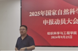 2024年9月25日下午,纺织科学与工程学院2025年国家自然科学基金项目申报动员大会在A103报告厅召开。纺织科学与工程学院院长付少海、科学技术研究院副院长柏玉香、江南大学附属医院科技处处长袁凤来、纺织科学与工程学院副院长马丕波,学院拟申报2025年国家自然科学基金项目的老师参加会议。会议由马丕波主持。