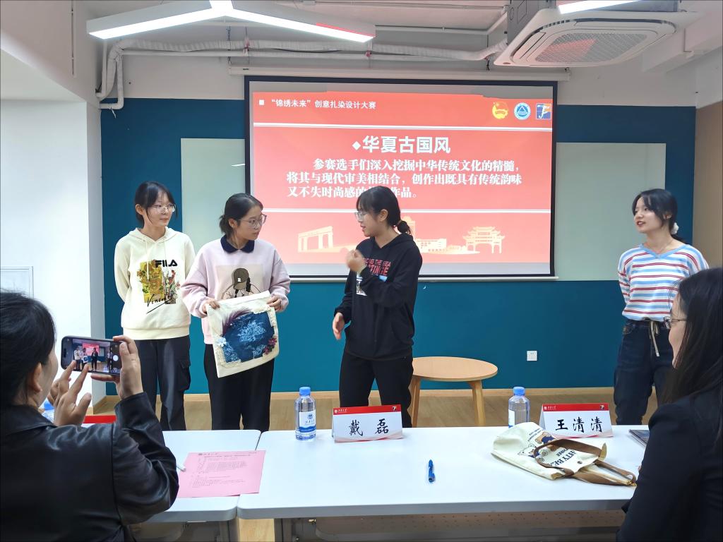 经纬织锦绣,妙染绘未来。自本届赛事启动以来,共有来自31支队伍的100余名同学报名参与,各团队围绕“赤子爱国心”“江南新图景”“华夏古国风”三个创作方向,融合传统扎染工艺与当今时代特色,创作极具艺术色彩的作品。比赛中,入围决赛的7支团队现场制作,将头脑中的灵感通过丝线和染料在布料上尽情挥洒。制作完成后,各团队现场展示并阐述扎染作品的创作主题与设计理念,并邀请评委老师进行打分点评。