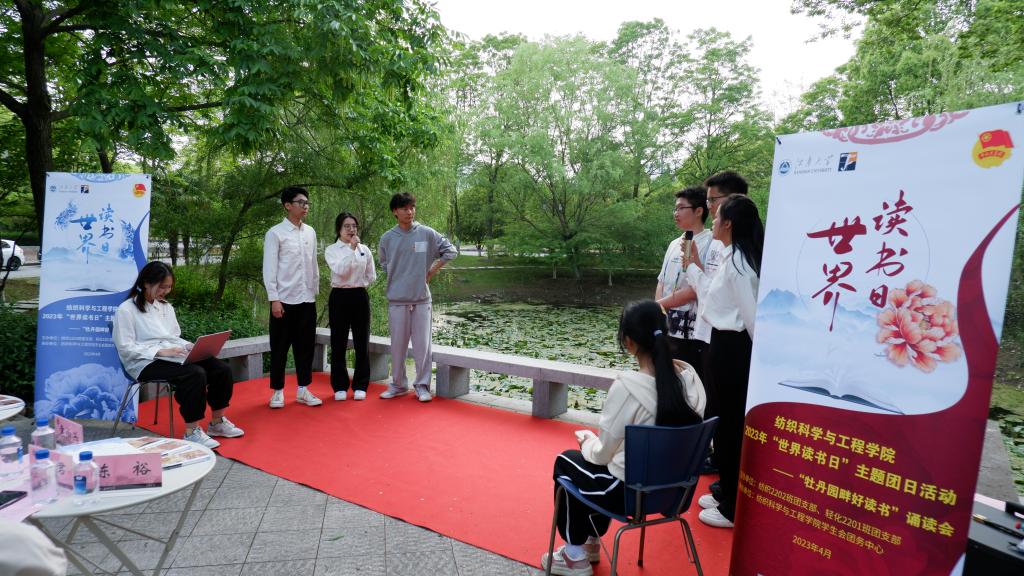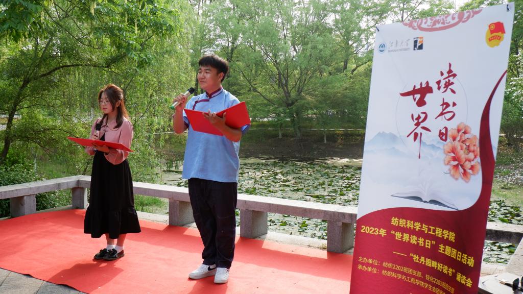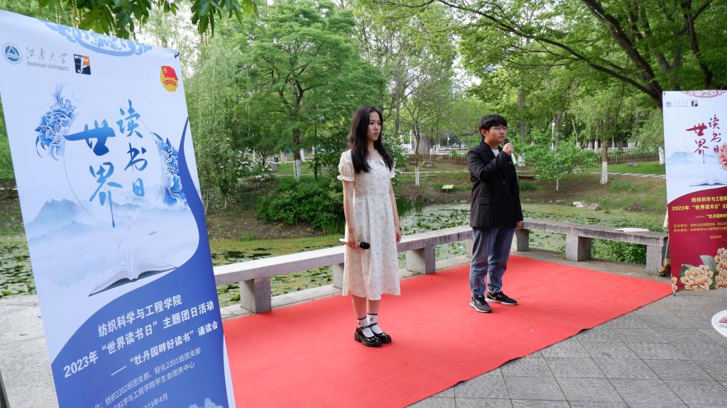 正是江南好风景,读书之乐乐陶陶。为深入学习贯彻党的二十大精神,纪念五四运动104周年,在第28世界读书日到来之际。419日下午,bwin必赢中国官网以基层团支部主题团日活动的形式,在学校牡丹园举办“牡丹园畔好读书”主题诵读会。bwin必赢中国官网关工委常务副主任袁伯兴,校团委副书记杨飏,bwin必赢中国官网党委副书记、副院长陈艳君,学校后勤管理处环境中心园艺花卉主管吴湘娟等,以及纺织2202班和轻化2201班的团员青年们参加诵读会,活动由纺织2202班团支部书记李子心主持。